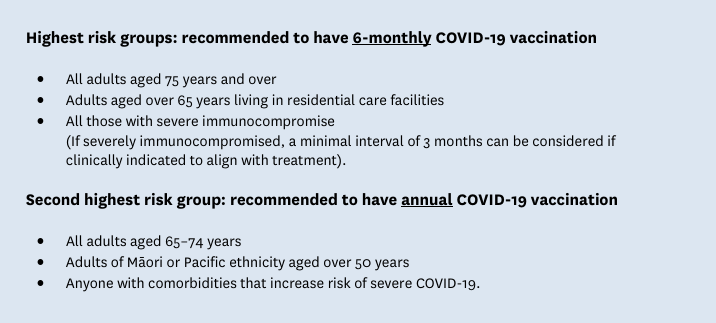 Getting the flu vaccine is a great time to also check for and receive any recommended COVID-19 vaccines. Like influenza, COVID-19 is highly contagious and can lead to severe respiratory illness and complications in older people and those with underlying medical conditions. It remains a leading cause of infection related hospitalisations and deaths in Aotearoa New Zealand, particularly for older adults. Once or twice-yearly additional doses of COVID-19 vaccine are encouraged if older or at higher risk of getting sick from COVID-19. These are important because vaccine protection decreases over time, and the vaccine is updated regularly to match changes in the circulating COVID-19 virus. In 2026, the vaccine has been updated to target the LP.8.1 variant.
